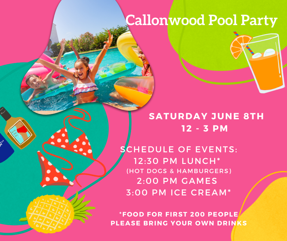 Callonwood Pool Party Saturday, June 8, 2024 12 - 3pm @ Pool Schedule of Events: 12:30pm Lunch* 2pm Games 3pm Ice Cream* *Food for first 200 people Please bring your own drinks.