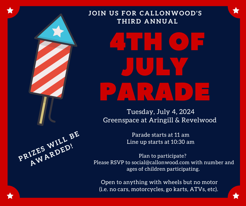 Callonwood Pool Party Saturday, June 8, 2024 12 - 3pm @ Pool Schedule of Events: 12:30pm Lunch* 2pm Games 3pm Ice Cream* *Food for first 200 people Please bring your own drinks. |